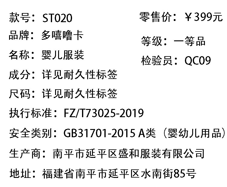 | 生产/经销/进口厂家: | 南平市延平区盛和服装有限公司 | 厂家地址: | 福建省南平市延平区水南街85号 |