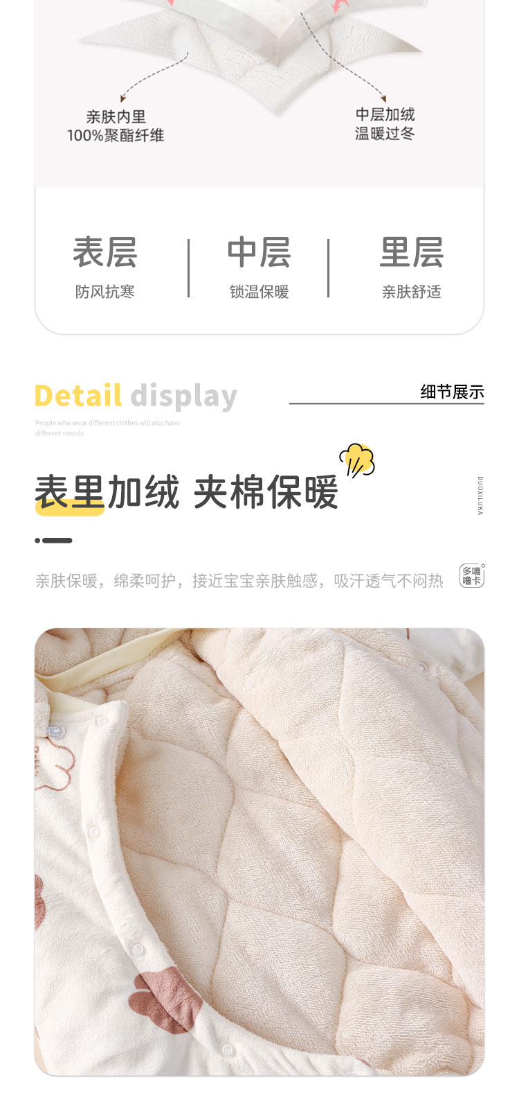 | 洗涤说明: | 收到深色衣服或者深浅拼色衣服时,先用清水将浮色货浮毛洗掉再穿哦 | 详细材质信息: | 面料:100%聚酯纤维 里料:100%聚酯纤维 填充物:100%聚酯纤维 |