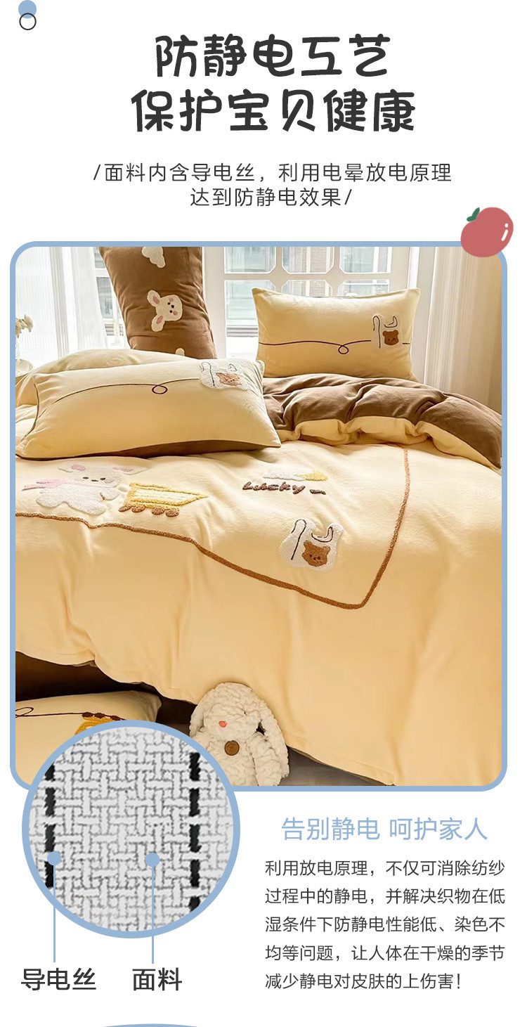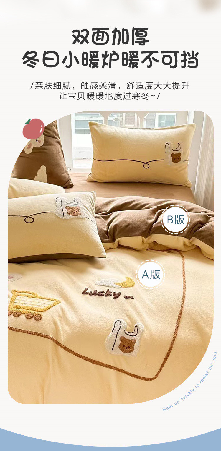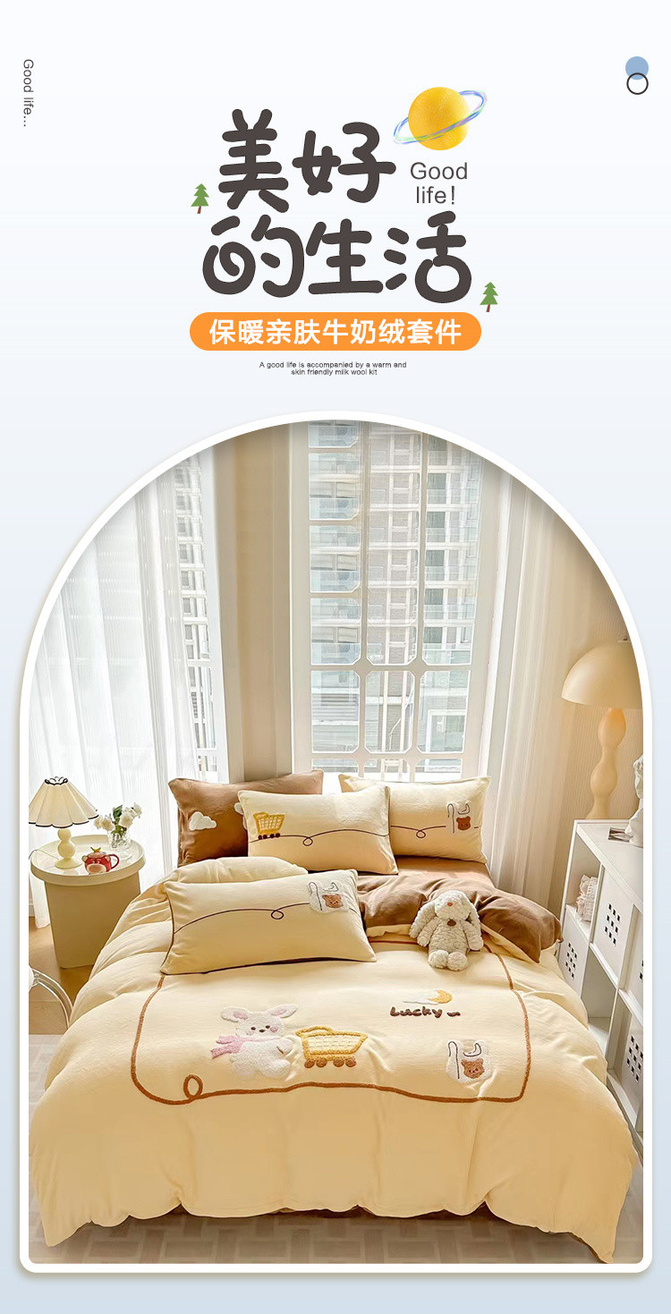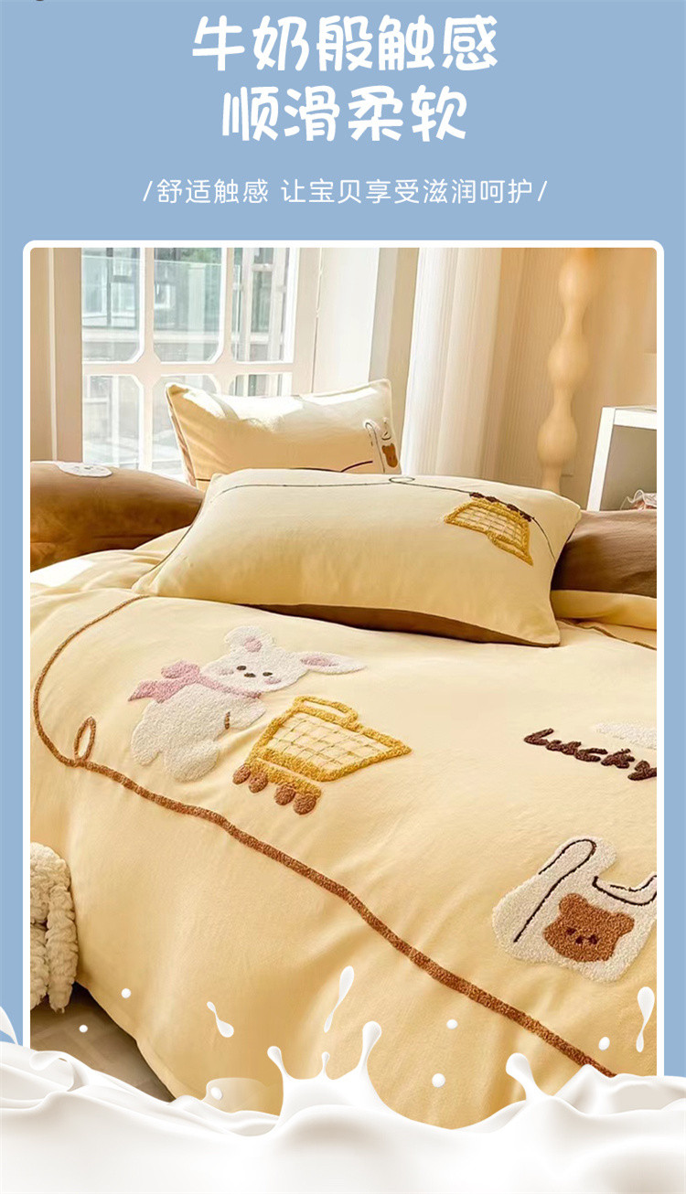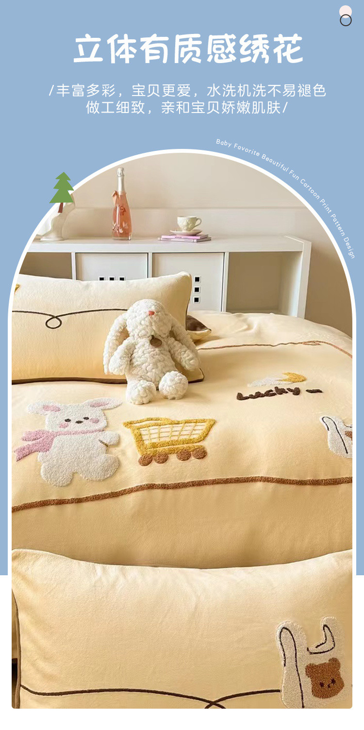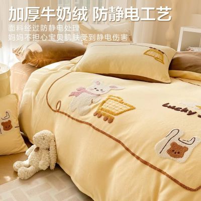 - 儿童绣花卡通牛奶绒套件加绒被套加厚双面绒床上用品